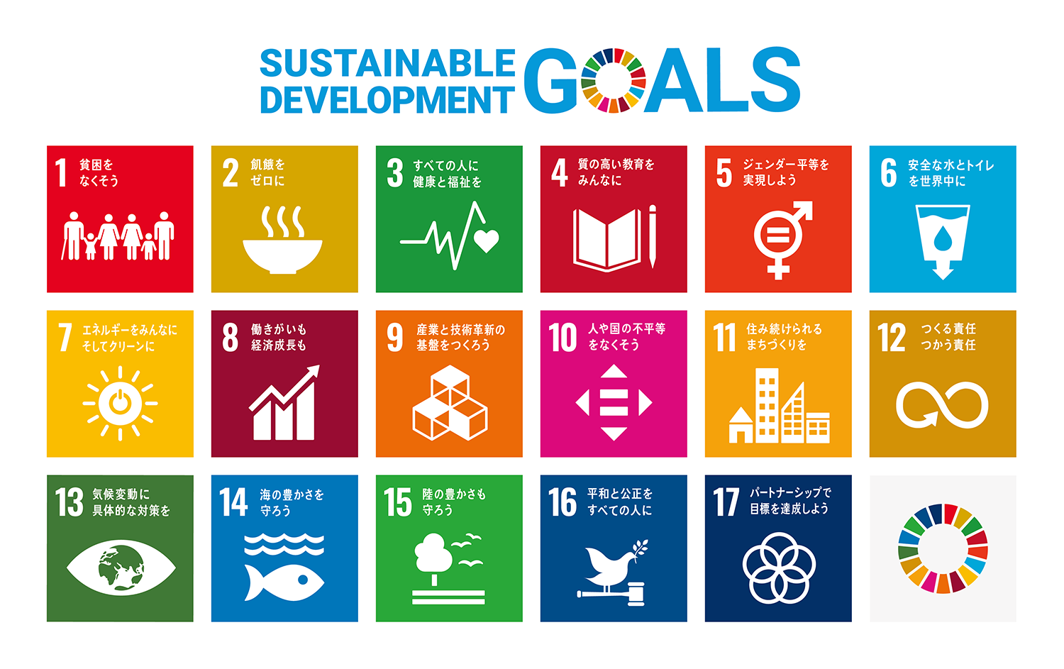 ・貧困、気候変動、人種・性差別、働き方などのさまざまな問題が顕在化する中、持続可能な社会をつくるために国連が定めた国際目標です。2030年までに解決すべき優先課題として、17の目標と169のターゲットが示されています。